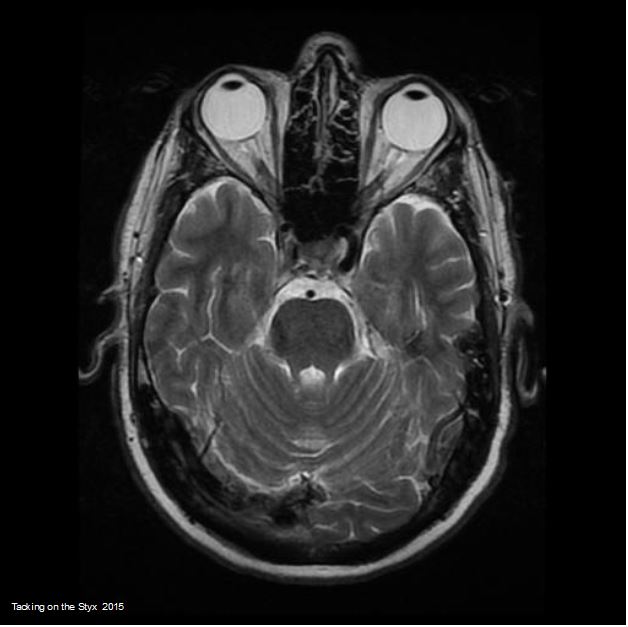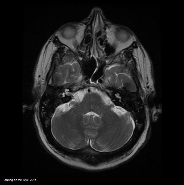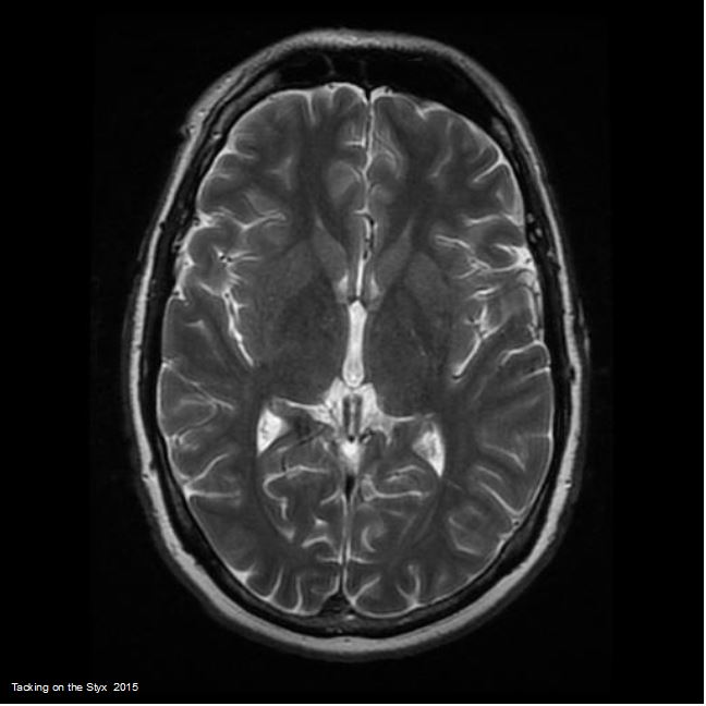 White, Anglo-American Male, 42 years old, with mesial temporal sclerosis, small posterior fossa stroke and scattered, small calcified plaques. Taken 2010 @ Beth Israel – Deaconess Hospital, Brookline, Massachusetts.
