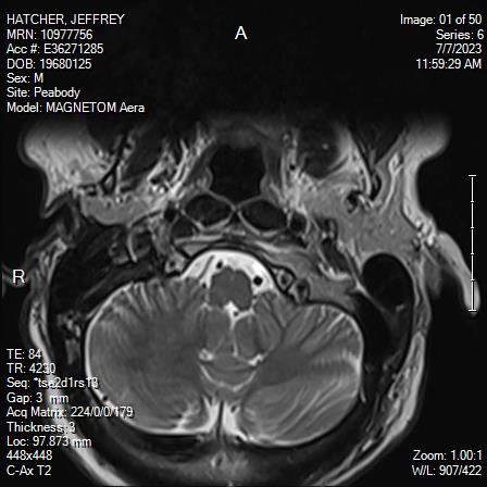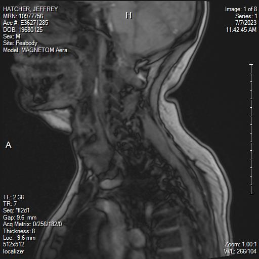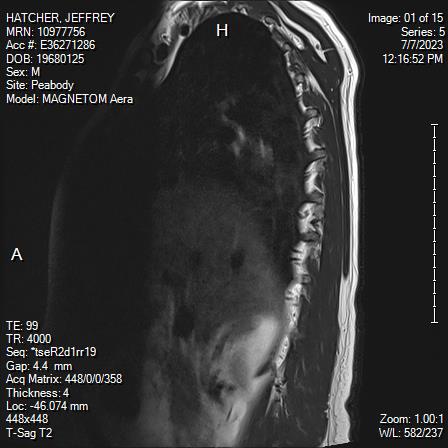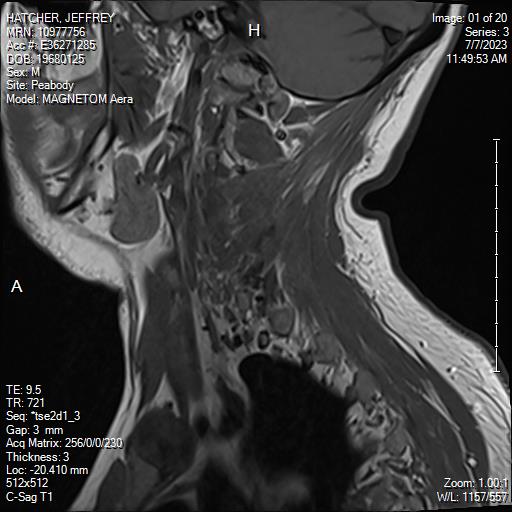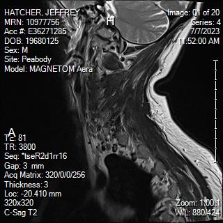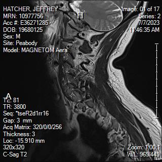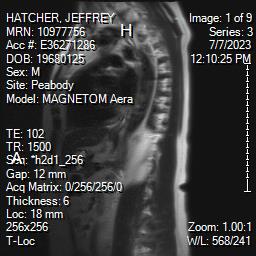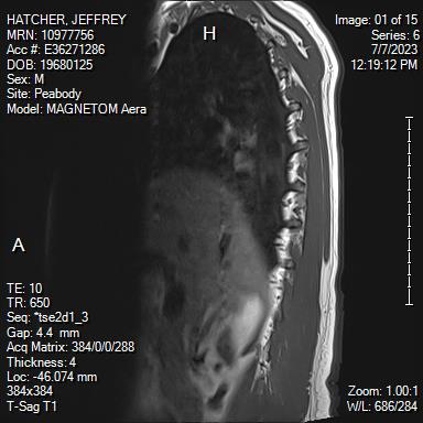 White Anglo-American male, 55 years of age with mild scoliosis and disk degeneration. MRI taken July, 2023 at Salem Hospital MRI facility using a MAGNETOM Aera model, 4 Centennial Drive, Peabody, Massachusetts.